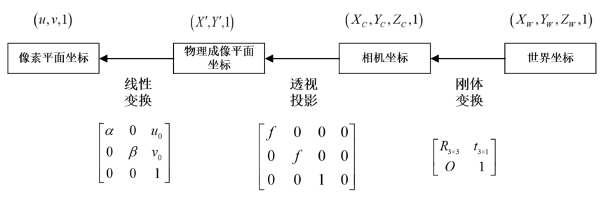 转换为矩阵形式: $$ Z \left( \begin{matrix} u \\\ v \\\ 1 \end{matrix} \right) = \left( \begin{matrix} f_x & 0 & c_x \\\ 0 & f_y & c_y \\\ 0 & 0 & 1 \end{matrix} \right) \left( \begin{matrix} X \\\ Y \\\ Z \end{matrix} \right) =KP $$ 其中,K为相机的内参矩阵。